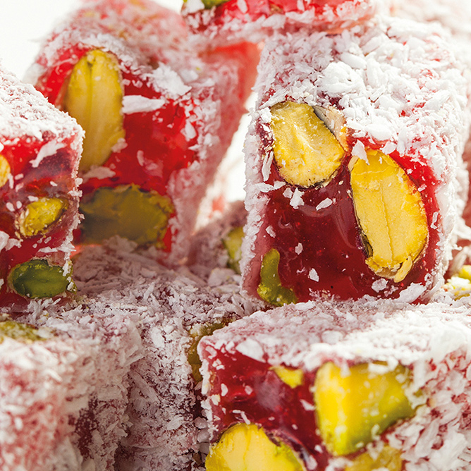 Yumuşacık dokusuyla, damak çatlatan Antep Fıstıklı Narlı Çifte Kavrulmuş Hindistan Cevizli 210 Lokum, uzun yıllardan beri kullanılan tarihi formülü ile özenle hazırlandı. Geleneksel bakır kazanlarda doğal içeriklerle üretilmektedir. Doğal şeker pancarının en doğal haliyle lokumun buluşmasını çok seveceksiniz. Ürünlerimizde kesinlikle glikoz şurubu kullanılmamaktadır.